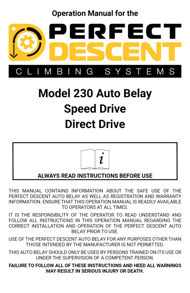Manuals Home » Manuals 230 Perfect Descent Auto Belay Operations Manual Download in a different language: Chinese, French, German, Italian, Japanese, Korean, Russian, Spanish Download 220 Perfect Descent Auto Belay Operations Manual Download in a different language: Chinese, French, German, Italian, Japanese, Spanish Download Perfect Descent Auto Belay Dual Spring Inspection Addendum Download Model 220/230 Perfect Descent Auto Belay Replacement Lanyard Manual Download in a different language: Chinese, French, German, Italian, Japanese, Russian, Spanish Download Perfect Descent Cleaning & Disinfecting Guidelines Download Perfect Descent Belay Gate User Manual Download Perfect Descent Belay Bar Mounting Kit User Manual Perfect Descent Belay Bar Mounting Kit User Manual Download
